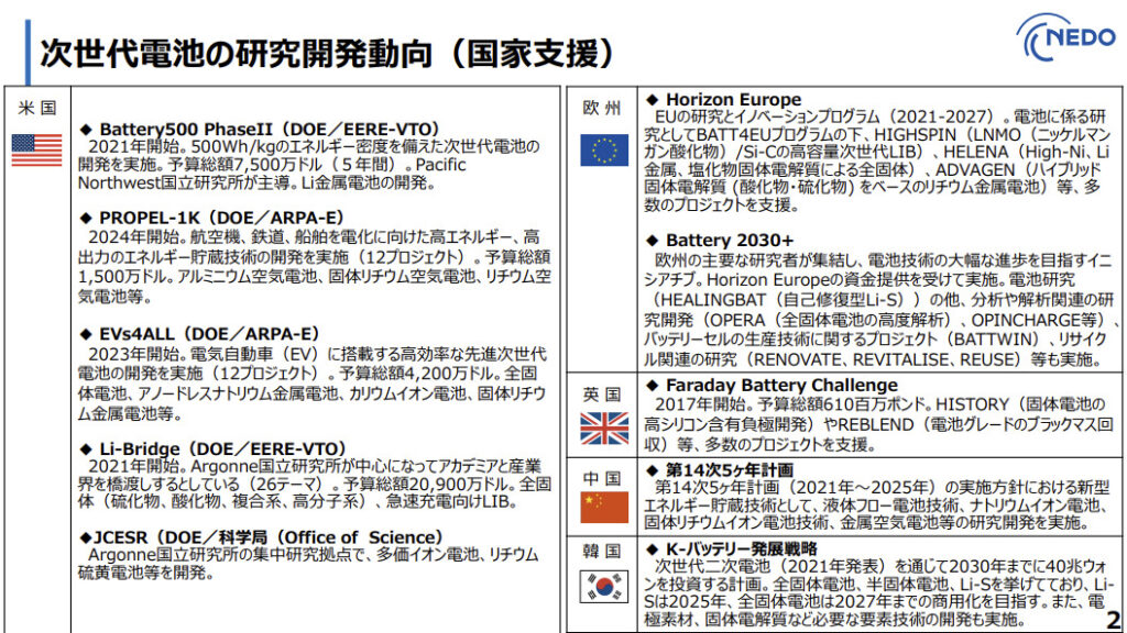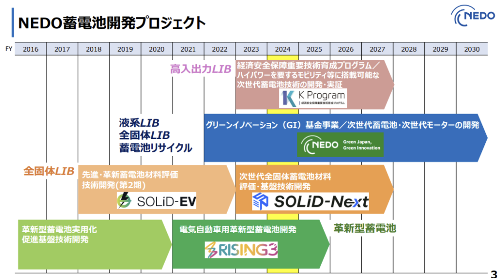日本政府は全固体電池の開発を国家戦略として位置づけ、NEDOやMETIの事業を通じて産学官の総力を結集した取り組みを進めています。高耐久型、高入力型、高エネルギー密度型のモデル電池開発が進められており、2024年度内には高入力型で9C(約7分での充電)を達成する見込みです。全固体電池特有の劣化機構の解明が進み、耐久性が大幅に改善されています。