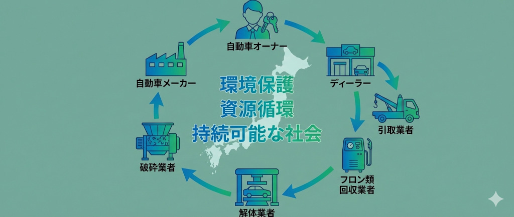 自動車リサイクルシステムは、**「ゴミを出さない、資源を無駄にしない」**車社会を実現するための仕組みです。車を廃車にする際に出るシュレッダーダスト、エアバッグ類、フロン類の3品目を適切に処理するため、新車購入時などにオーナーが「リサイクル料金」をあらかじめ預託します。