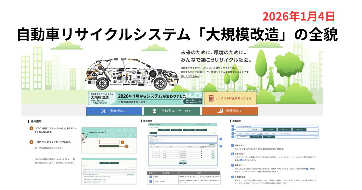 自動車リサイクルシステムが、運用開始から約20年という節目を迎え、ついに**2026年1月4日に「大規模改造」**を実施します。日々システムを操作するディーラーの業務担当者の皆様、そしてこれから車を手放す一般ユーザーの皆様にとって、この変更は無視できない非常に大きなアップデートです。
