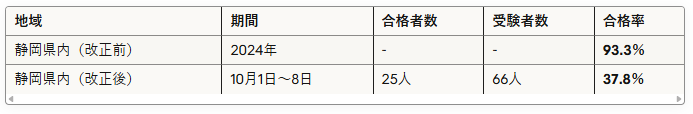 - 改正後の学科試験合格率:37.8%(従来93.3%から55ポイント以上減少)