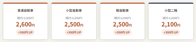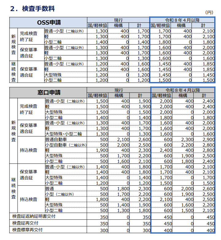 - 継続検査(車検)は普通・小型・軽とも+300円。小型二輪も+300円