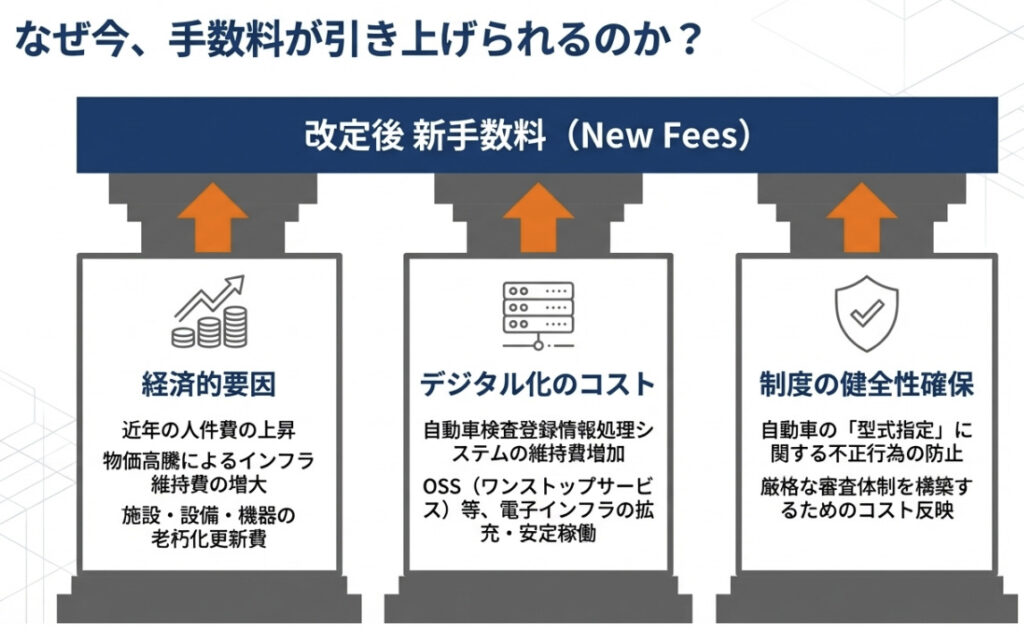 今回の手数料改定は、2026年3月6日に閣議決定・3月11日に公布された「道路運送車両法関係手数料令の一部を改正する政令」に基づくものです。施行日は令和8年4月1日。年度末の繁忙期と重なるこのタイミングで、改定の必要性はどこにあったのでしょうか。主な理由は大きく3つに分けられます。