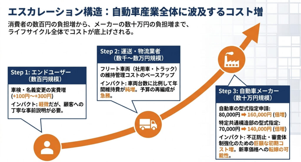この一連の問題が、今回の手数料改定における審査体制強化コストの根拠となっています。国は「同じことを二度と繰り返させない」という強い意志を、型式指定申請手数料の倍増(8万円→16万円)という形で明示したのです。自動車業界に身を置く者として、この改定の重みを正確に受け止めてほしいと思います。