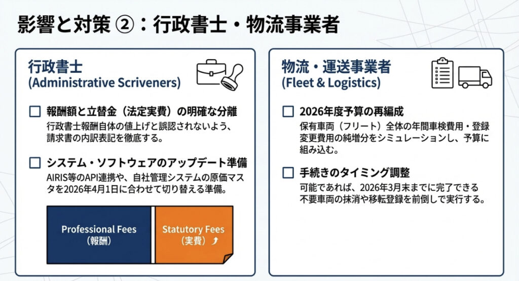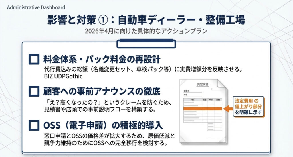 「登録諸費用」や「車検パック」などの料金設定を、2026年4月1日以降の申請分から新料金に切り替える必要があります。特に業者向けパック料金や名義変更セット料金は、法定費用が増額されることを前提に再設計が必要です。見積書・請求書フォーマットの改訂、POSシステムや会計ソフトのマスタ更新も忘れずに行いましょう。