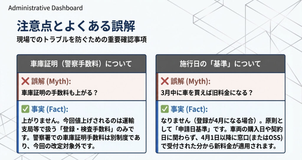 3月中に受付・準備を進めていても、運輸支局への実際の申請が4月1日以降になれば新料金が適用されます。期をまたぐ案件を抱えている場合は、顧客への事前説明と料金の再確認を必ず行いましょう。トラブルの種になりやすいポイントです。
