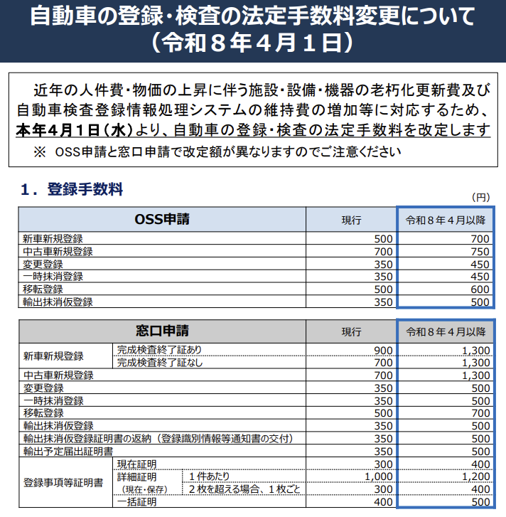 中古車の新規登録(窓口申請)は現行700円から1,300円へと+600円(約86%増)と最大の上昇幅です。一方でOSS申請は700円→750円と+50円にとどまります。この極端な差は、中古車登録においてもOSS化を一気に推し進めようとする国の戦略を如実に反映しています。