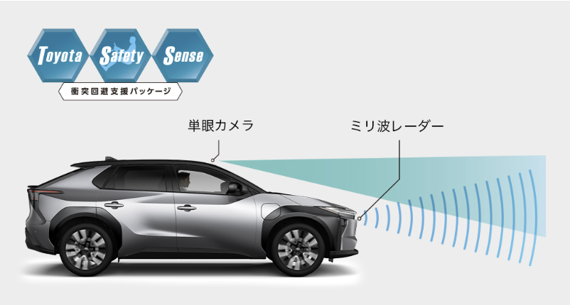 新型bZ4Xには、最新の「Toyota Safety Sense」が全車に標準装備され、大幅に進化を遂げています。このシステムは、車両だけでなく、歩行者、自転車運転者に加え、新たに二輪車の検知も可能になったことで、より広範囲の危険を察知し、安全な運転環境を提供します。