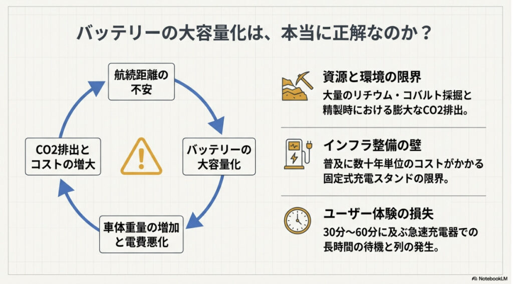 だが、私はこう思う。電池を巨大化するという方向性は、果たして「正解」なのだろうか?