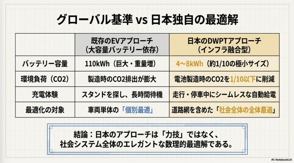 電池を巨大化して問題を「力でねじ伏せる」欧米・中国の戦略に対して、日本は「道路インフラと車両を融合させることで電池を最小化し、社会全体でエネルギーを最適化する」という全く異なるアプローチで挑んでいる。どちらが真のサステナブルかは、自動車業界のプロとして見れば明らかだ。