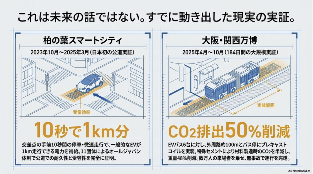 • 2023年10月〜2025年3月:柏の葉スマートシティで日本初の公道実証実験。「10秒で1km分」の給電性能を確認