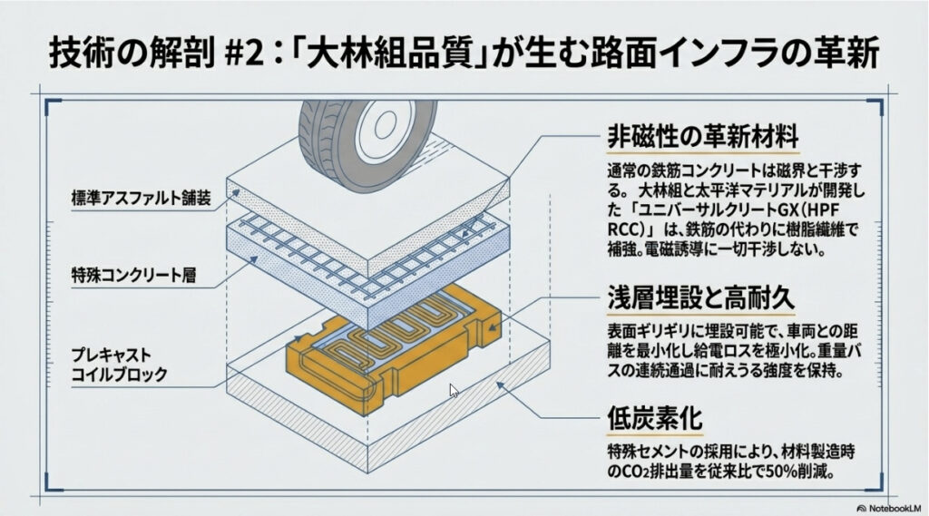 道路の強度・耐久性・電磁気的な非干渉性・環境負荷の低減、すべてを同時に実現する。これが「大林組品質」だ。日本の建設・土木技術が、EV革命の縁の下の力持ちになっている。