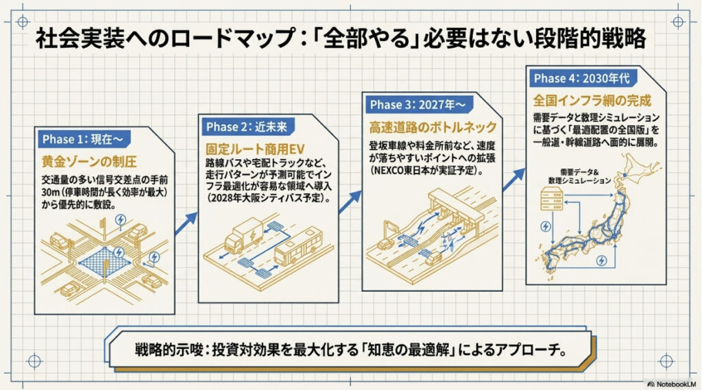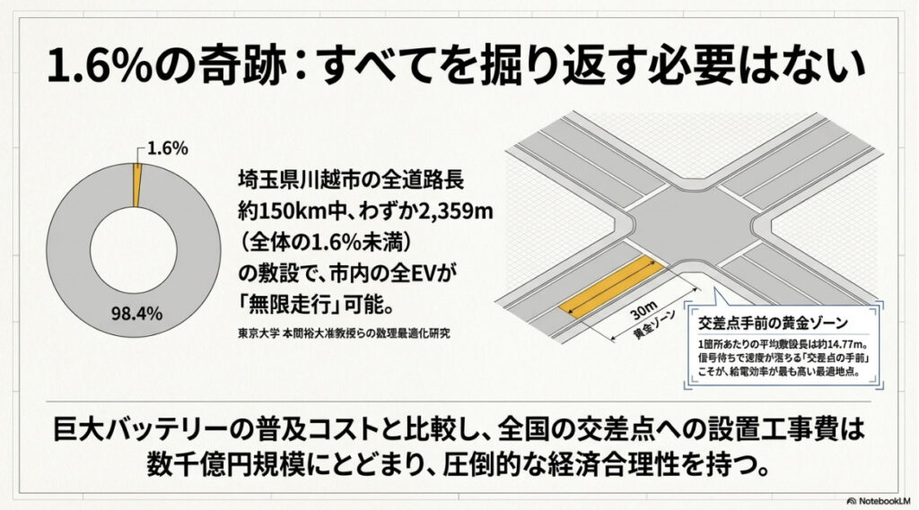 1.6%。全道路の1.6%だ。道路をすべて掘り返す必要は一切ない。交通量が多く、信号で車が止まりやすい「交差点の手前」を中心に、戦略的・数理的に最適配置するだけで、街全体のEVが電欠の心配から解放される。