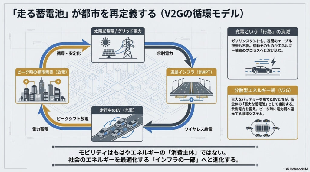 。車両に蓄えられた電力を、ピーク時に電力網へ戻す「V2G(Vehicle to Grid)」技術との組み合わせにより、EVの集合体が街の巨大な蓄電池として機能するようになる。太陽光発電の余剰電力をEVに充電し、電力需要の高い時間帯に街へ還元する――これが「走る蓄電池が街を変える」という意味だ。