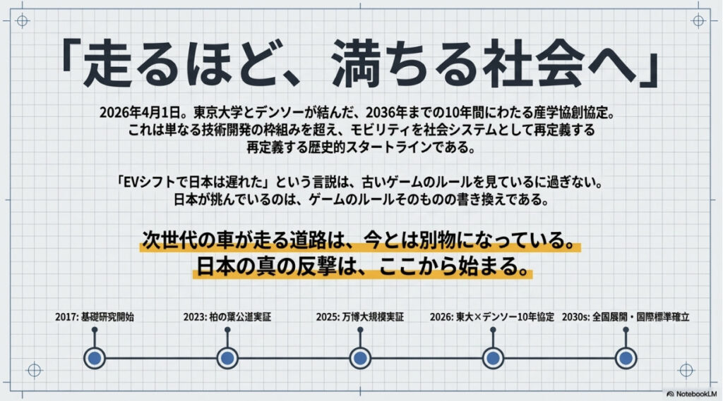 2017年にJSTの未来社会創造事業に採択されてから約10年。地道な基礎研究から公道実証、万博での大規模実装まで、日本の研究者と企業は愚直に積み上げてきた。2026年4月、デンソーと東大が10年間の長期協定を結んだ今、この技術は「いよいよ本番」の段階に入った。