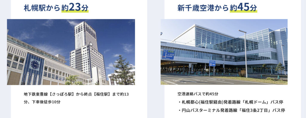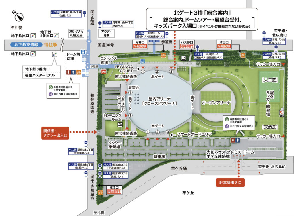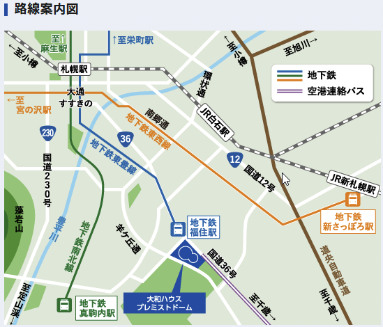 福住駅は札幌市営地下鉄東豊線の終着駅で、札幌駅からは乗り換えなしで約13分でアクセスできます。駅から会場までは、案内表示に従って徒歩約10分の距離です。