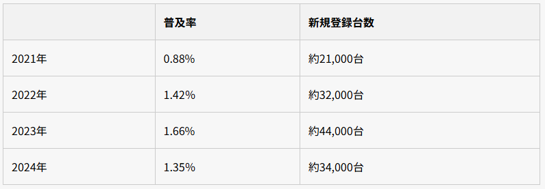 2021年は0.88%(約21,000台)、2022年は1.42%(約32,000台)となっており、2023年には1.66%(約44,000台)で推移しています。