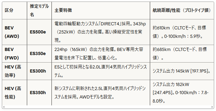 新型ESは、HEVとBEVを併せ持つ多様な電動車モデルラインアップで全面刷新しました。日本仕様としては、ハイブリッド2種類とバッテリーEV1種類(ES350e/ES500eのいずれかがメイン、または両方で計3モデル構成とみられる)の計3モデルのパワートレインが導入される予定です。