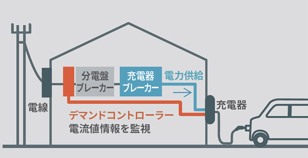 販売店装着オプションの「デマンドコントローラー」を使用すれば、家全体(または事業所全体)の電気使用量を監視しながら充電出力を自動調整できるため、ブレーカー落ちを防ぎつつ電気料金の節約にも貢献します。