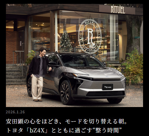 第1弾では、俳優の安田顕さんを起用し、日常にある上質な時間や価値観を切り取り発信するウェブメディア「Pen Online」にて、「bZ4X」とともに、仕事前の気持ちを入れ替える時間や休日の気分転換の様子を前後編で公開。