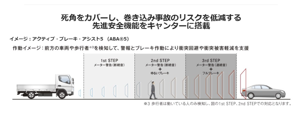 都市部での配送業務において、左折時の巻き込み事故は最も恐れられる事故のひとつです。このシステムは、そうした悲劇を未然に防ぐための「命を守る技術」です。競合するいすゞ「エルフ」も同様のシステムを搭載していますが、キャンターの被害軽減ブレーキ機能は、より確実な制動力を発揮すると評価されています。