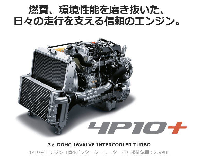 搭載される3L直4インタークーラーターボエンジン「4P10+」は、フィアットグループのFPT社、ダイムラー(現:メルセデス・ベンツ・グループ)、そして三菱ふそうが共同開発した先進のユニットです。