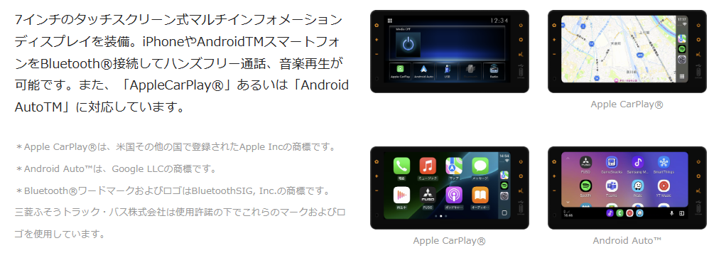 **デュトロとの比較:**安全装備では互角ですが、キャンターはApple CarPlay/Android Auto対応など、デジタル装備の充実度で一歩リード。