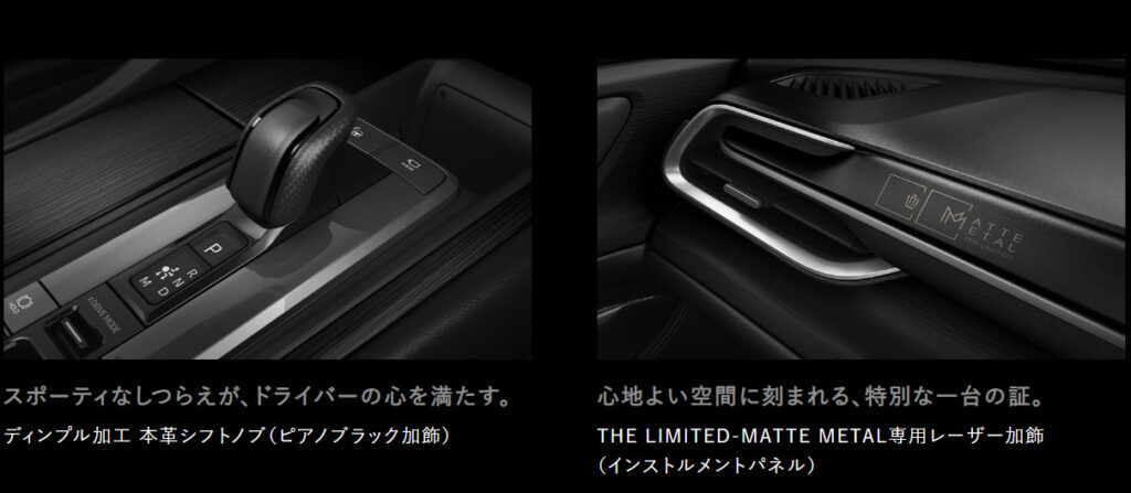 | 2. デザイン | 最大の目玉である「マットメタル」外板色。特別開発されたマット(艶消し)塗装が施され、圧倒的な存在感を放ちます。ホイールやグリルモールも専用のブラック加飾となり、漆黒の統一感が際立ちます。 |