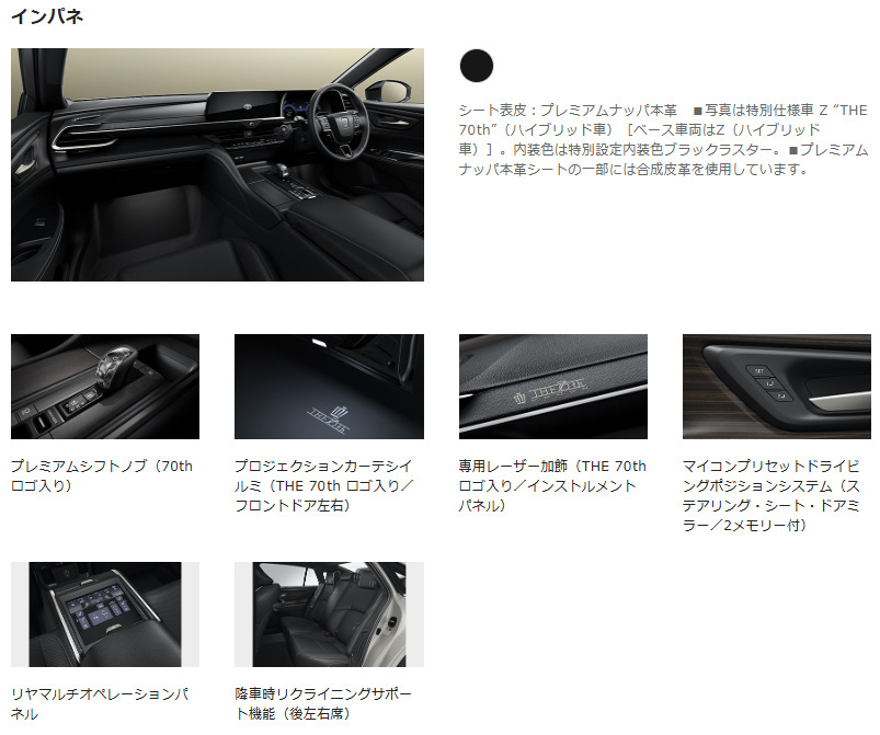 THE 70th プレミアムシフトノブ、専用インストルメントパネル、専用キー、プロジェクションカーテシイルミ、マニュアルケースなど、特別感のあるアイテムが用意されます。