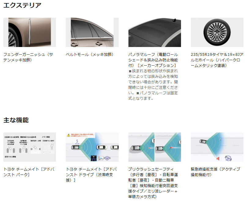 新型クラウンセダンには、多彩なオプションが用意されています。特におすすめなのが以下の3つです。