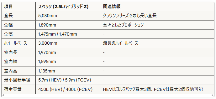 | 7. こんな人におすすめ | **長距離移動が多く、高い静粛性と燃料効率を求める方。**伝統的なクラウンの安心感と、セダンとしての格式を重視する、最も標準的なユーザーに最適です。 |