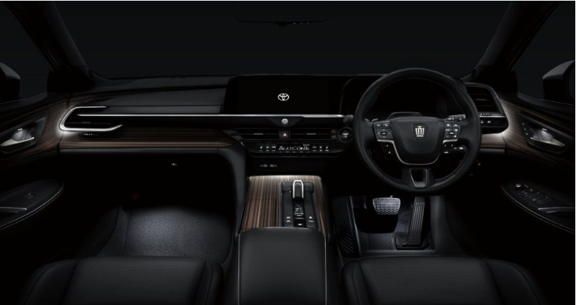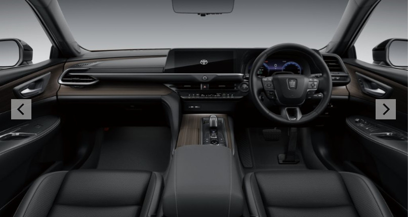 クラウンシリーズ共通の「アイランドアーキテクチャ―」に基づき、運転のしやすい運転空間を確保しつつ、インパネの更なるワイド化と杢目調パネル(インストルメントパネル、センターコンソール、ドアトリム)の採用により、落ち着きと広がりのある室内空間を演出しています。
