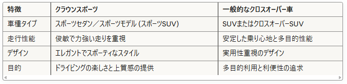 クラウンスポーツは、運転の楽しさやドライビングフィールにこだわるユーザーに向けた車種であることが分かります。