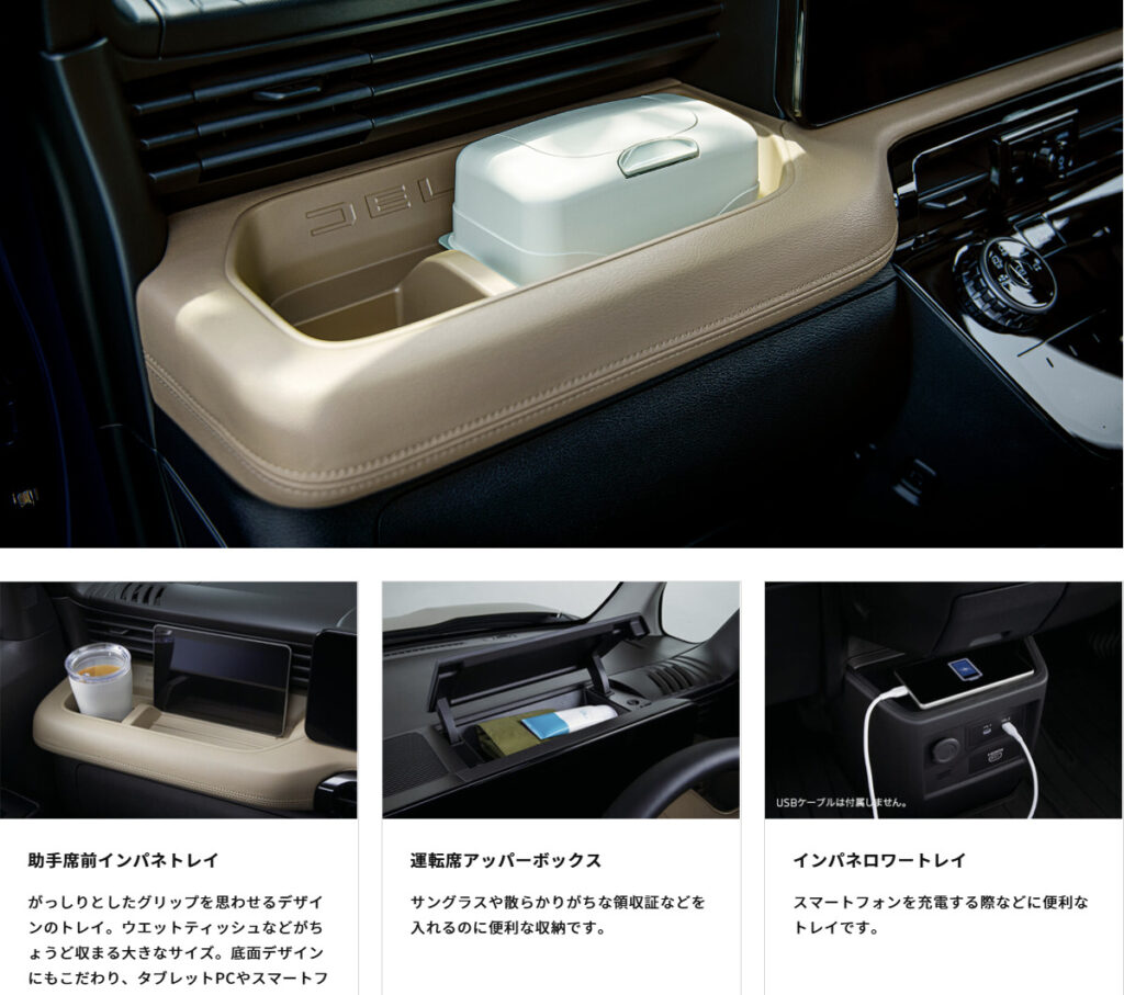 新型では収納の使い勝手も大幅に改善。USBポートと併設したインパネロワートレイ、助手席前インパネトレイ、運転席アッパーボックスなど、使いやすさにこだわった豊富な収納スペースを確保しています。