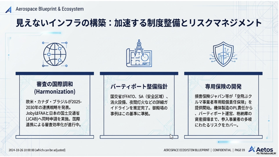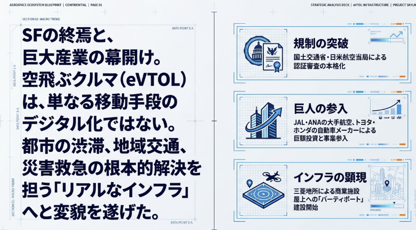 空飛ぶクルマは、もはやSFの世界の話ではありません。機体開発、地上インフラの設計指針、そして法整備と保険。社会実装に必要なパズルのピースは、今まさに日本国内で組み合わされようとしています。
