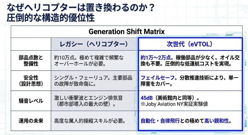 ヘリコプターは約10万点もの部品で構成される極めて複雑な機械です。一方、eVTOLは約1万〜2万点程度と、部品点数が圧倒的に少なくなっています。これは単なるコスト削減の話ではありません。複雑な機構が少ないということは、整備のたびにオーバーホールが必要となる「メンテナンスの壁」を大幅に低くすることを意味します。