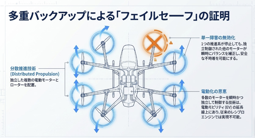 この設計思想は航空機の世界では「フェイルセーフ」と呼ばれ、いかなる単一障害点も致命的にならないように設計するというものです。電動化によって多数のモーターを独立制御できるようになったことで、eVTOLはこの設計原則を実現しやすい構造的な優位性を持ちます。
