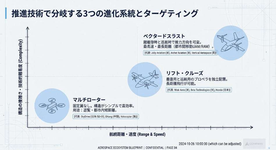 eVTOLは、その推進形態によって主に3つのタイプに分類されます。