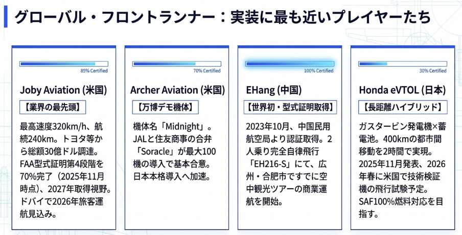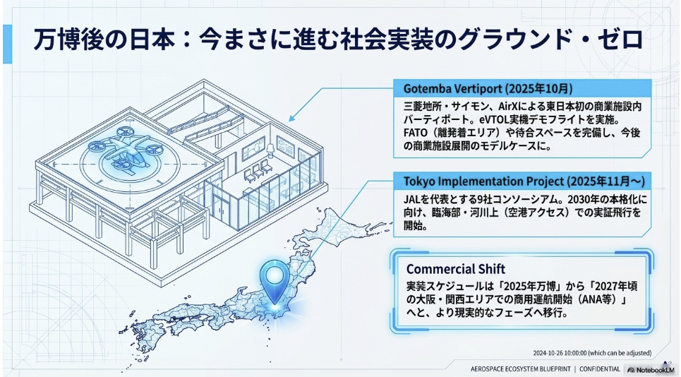 大阪・関西万博では「実証の場」として種がまかれ、2025年秋には御殿場で商業施設バーティポートが現実のものとなり、東京では2030年に向けたプロジェクトが走り始めました。世界ではJoby Aviationがドバイで2026年の旅客運航開始へと近づき、EHangがすでに中国で観光フライトを販売しています。