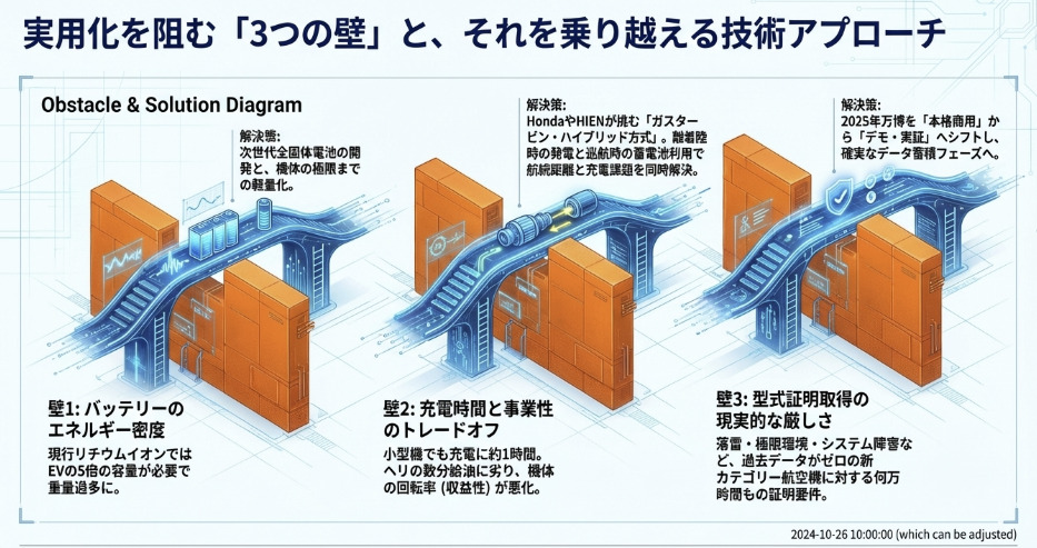 5人乗り程度の機体でも、電気自動車(EV)の約5倍以上の電池容量が必要です。しかし現行のリチウムイオン電池では機体が重くなりすぎ、運用効率に明確な限界があります。この問題が、バッテリー技術の進化を業界全体の命運を左右する最大課題に押し上げています。