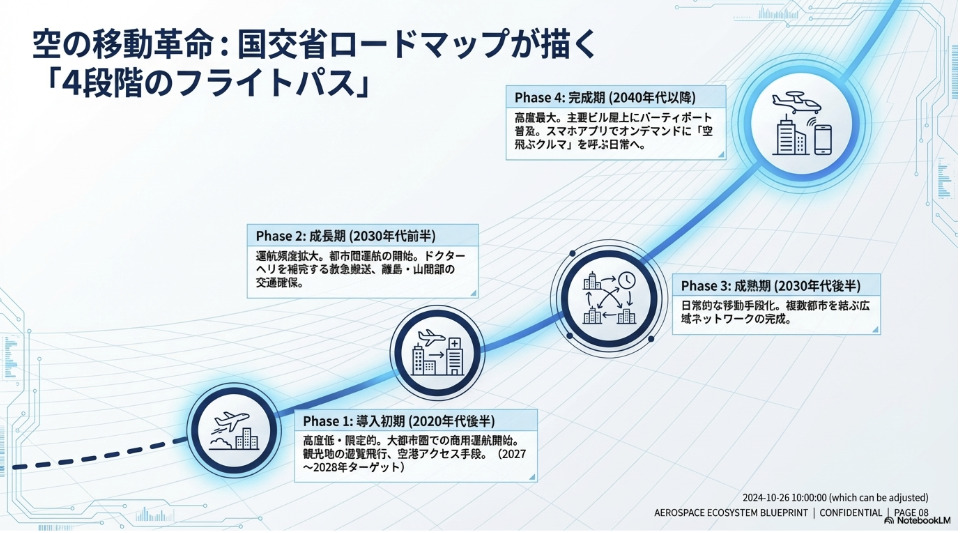日本政府は「空の移動革命に向けた官民協議会」を通じて、着実に環境整備を進めています。