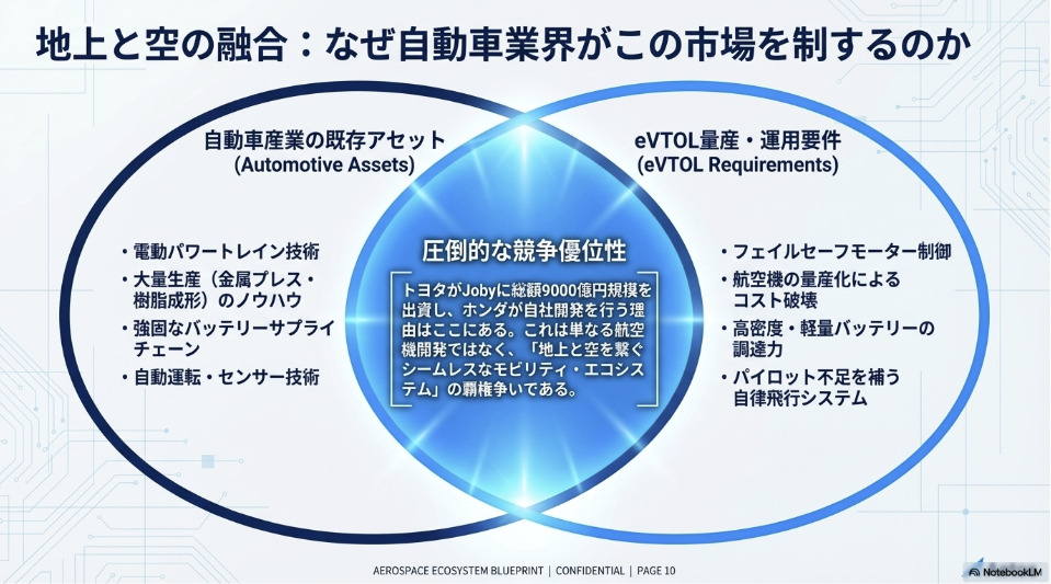 本記事を読んでいる自動車業界の方々にとって、eVTOLは「航空機の話」として距離感を覚えるかもしれません。しかしこの技術革命は、自動車産業と極めて深いところで交差しています。