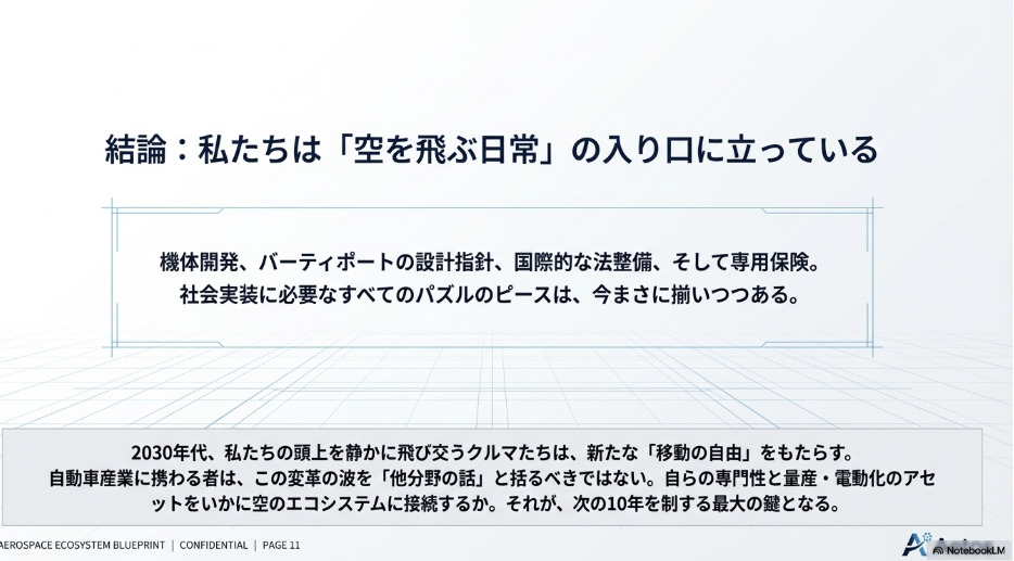 2030年代、私たちの頭上を静かに、そして安全に飛び交うクルマたちが、新しい「移動の自由」をもたらす未来はすぐそこまで来ています。自動車業界に携わる者として、この変革の波を「航空機の話」と括らず、自らの専門性と掛け合わせながら注視していくことが、次の10年を制する鍵になるのではないでしょうか。