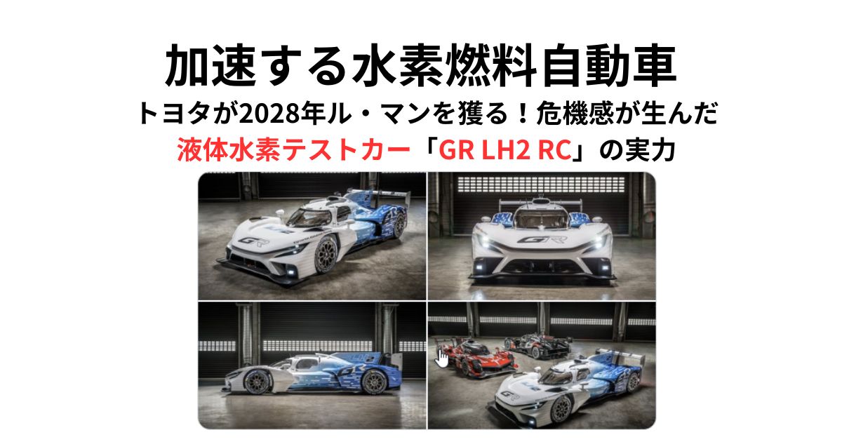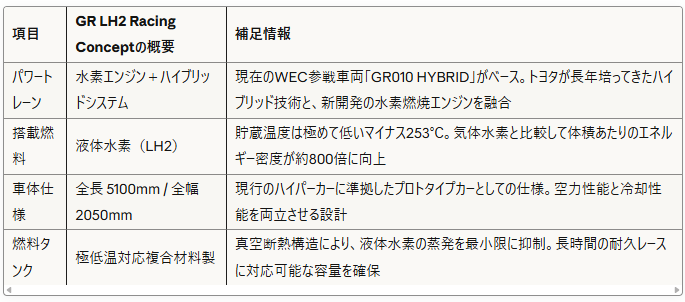 - トヨタの挑戦: トヨタは、現在のWEC車両をベースに、液体水素(LH2)エンジンとハイブリッドシステムを組み合わせたプロトタイプカー**「GR LH2レーシング・コンセプト」**の開発を進めています。これは、水素を燃焼させてパワーを得るエンジン技術で、市販車へのフィードバックも期待されています。