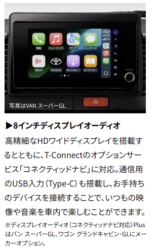 8インチの大型ディスプレイオーディオが全車標準装備され、スマートフォンとの連携も強化されました。Apple CarPlayやAndroid Autoに対応し、使い慣れたスマートフォンのアプリをそのまま車内で利用できます。T-Connectのコネクティッドナビにも対応し、最新の交通情報を活用したルート案内が可能です。