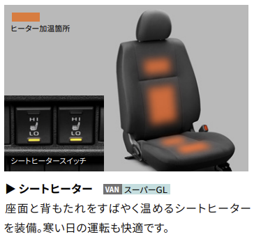 スーパーGL(バン)には2段階切替式(Lo-Hi温度切替機能付)の前席シートヒーターが標準装備され、冬場の作業や長距離ドライブの快適性が大幅に向上しています。寒冷地での早朝作業や、エアコンが効くまでの時間を快適に過ごせます。