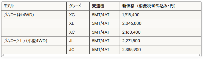 しかし、この大幅な機能強化に伴い、価格改定も実施されました。ジムニーの価格帯は1,918,400円〜2,160,400円に、ジムニーシエラは2,271,500円〜2,385,900円に改定されています。