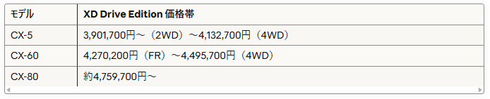- CX-60/CX-80: 従来の「XD SP」「XD L Package」「XD Exclusive Mode」などが廃止されています。