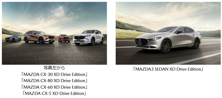 マツダ株式会社(以下、マツダ)は、「MAZDA3(マツダスリー)」「MAZDA CX-30(マツダ シーエックスサーティ)」「MAZDA CX-5(マツダ シーエックスファイブ)」「MAZDA CX-60(マツダ シーエックスシックスティ)」「MAZDA CX-80(マツダ シーエックスエイティ)」の5車種にクリーンディーゼルエンジン専用の新機種「XD Drive Edition」などを追加し、全国のマツダ販売店を通じて、本日より予約受注を開始します。販売開始は10月上旬以降、順次行う予定です。
