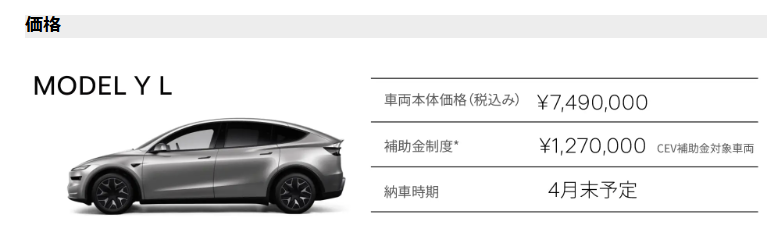 Model Y Lは、国の「クリーンエネルギー自動車導入促進補助金(CEV補助金)」の対象となっており、127万円という高額な補助金を受けることが可能です。2026年4月以降も、テスラへのCEV補助金は上限額130万円に迫る127万円が適用されることが確定しています。