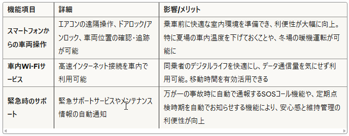 私が特に注目しているのは、車両リモート操作機能です。真夏の炎天下に駐車した車両に乗り込む前に、スマートフォンアプリから遠隔でエアコンを起動させておけば、乗車時には快適な室温になっています。また、寒冷地において冬場の暖機運転を自宅から行えることは、日常的な利便性として計り知れない価値があります。